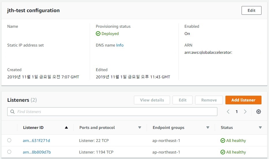 Accelerator 를 생성하고 Listeners ID 를 생성할떄 region 을 지정하고 Endpoint groups 을 인스턴스 ID로 설정하면 status 를 업데이트 한다. ALL healthy 로 보이면 정상적으로 연결된것이다.