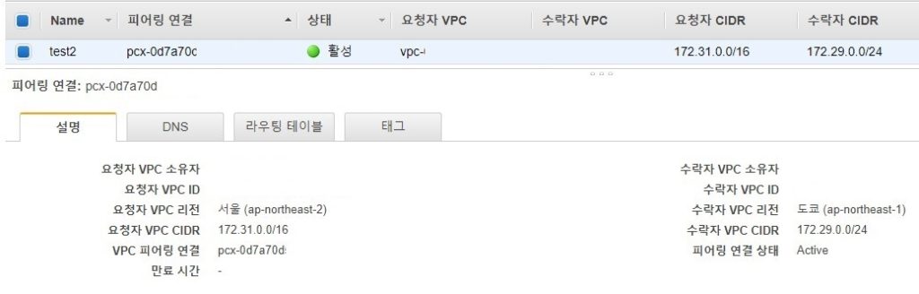 현재 서울 172.29.0.0/24 -> pcx 도쿄 172.31.0.0/20 -> pcx 로 라우팅 테이블을 설정 하였다. 테스트는 인스턴스 내부에서 ping 으로 확인하면된다.