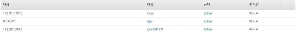 피어링으로 끝이 아니라 두개의 VPC에서 라우팅을 설정해줘야 한다.