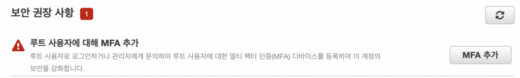 MFA는 사용하지 않으면 IAM 대시보드에 바로 경고가 떠있다. MFA 를 생성하자.