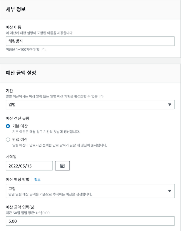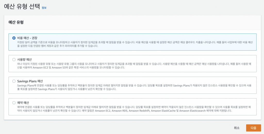 예산 관련 옵션 들은 FinOps를 위한 여러가지 기능을 제공하는데 우리는 그냥 비용 예산을 작성하면 된다.