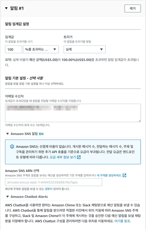 이메일 수신자에 받고싶은 이메일을 넣어도 되고 SNS 에 주제와, 구독을 생성하여 SMS등으로 받을수도 있으며, Chatbot Alerts를 이용하여 슬랙등 여러 Bot으로 알럿을 받을수 있다. 이메일은 무료고 뒤의 두가지는 비용이 발생할수 있으므로 메일로 받고 관리해야하는 서비스라면 봇이나 SNS를 이용하길 바란다.