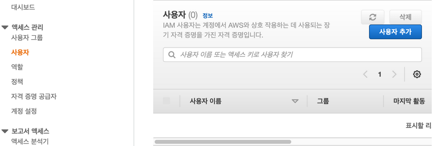 IAM 서비스로 이동하고 사용자탭으로 이동해서 사용자 추가를 누른다.