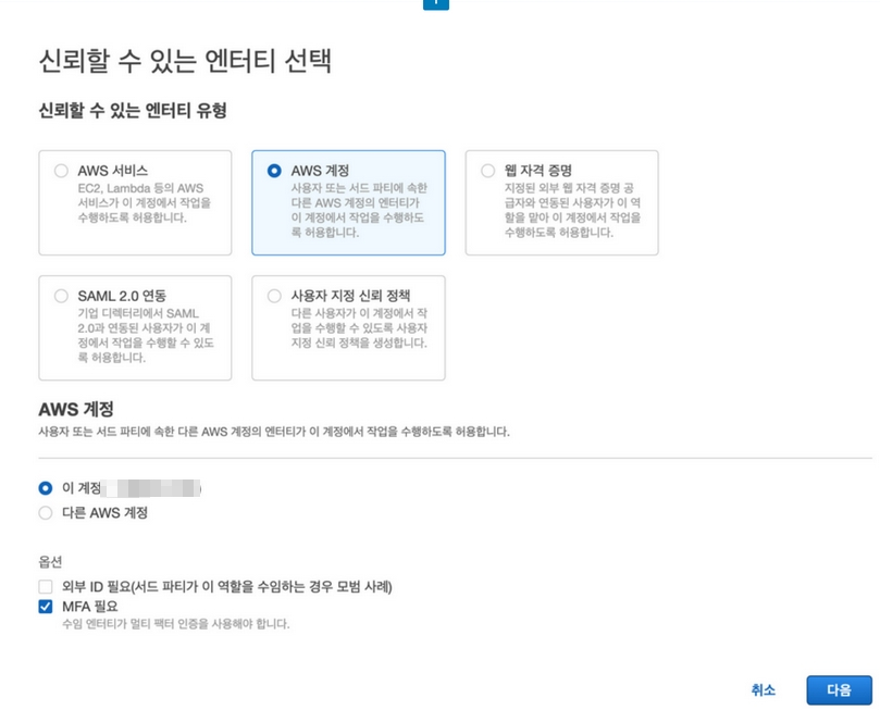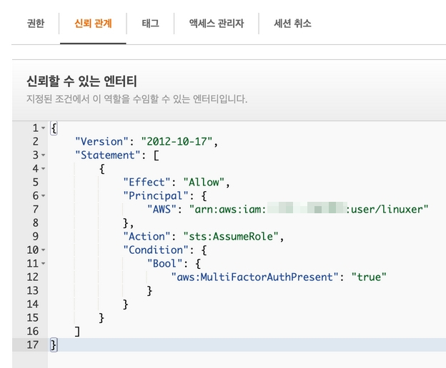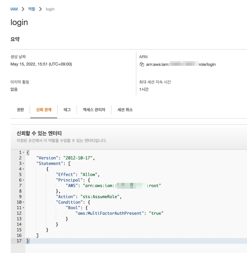 신뢰관계를 수정하면 이제 생성했던 계정이 이 역할을 사용할수있다. 덤으로 MFA가 활성화 되어야지 만 이 역할을 사용할수 있다.