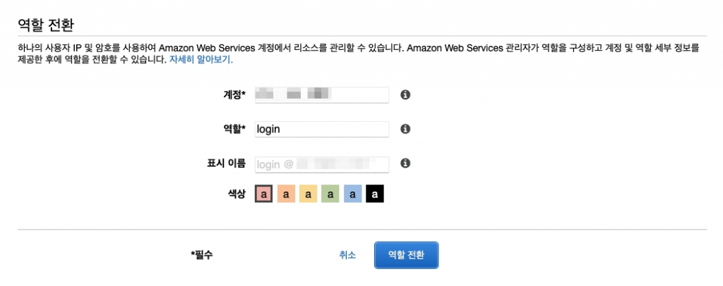 일반적으로 이 방식은 타 계정에서 어카운트를 생성하지 않고 로그인할때 사용하는 방식이다. 혹시 관리계정이 있다면 그관리계정에서 역할전환을 하는것이 더욱 권장되는 방식이다.