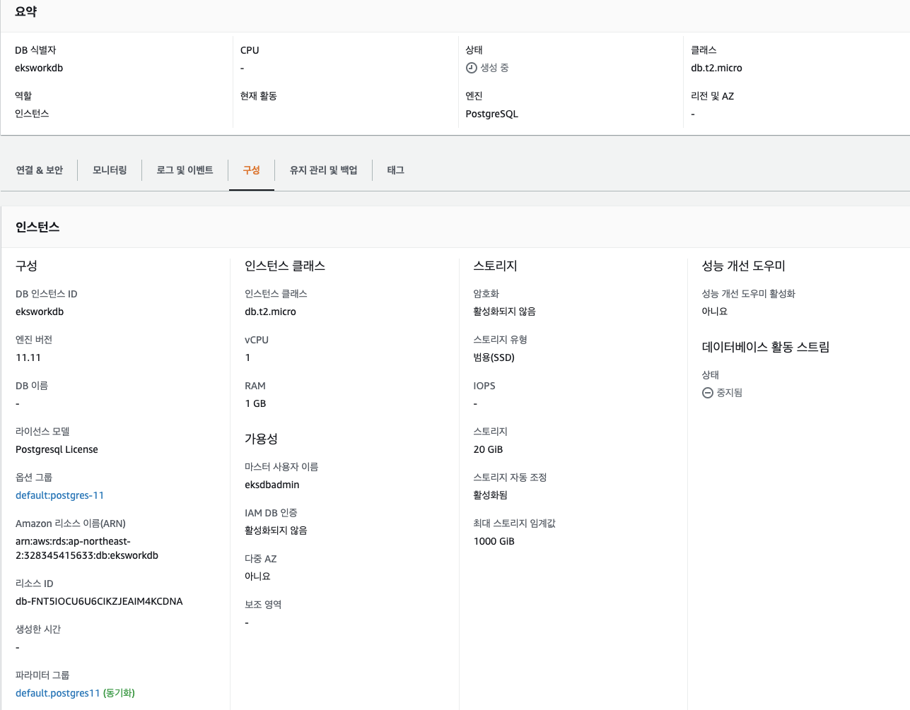 RDSEP=eksworkdb.cnnbttekipxl.ap-northeast-2.rds.amazonaws.com createuser -d -U eksdbadmin -P -h $RDSEP mywork Enter password for new role: Enter it again: Password: #디비 생성 PGPASSWORD=$AppDbPw createdb -U mywork -h $RDSEP -E UTF8 myworkdb