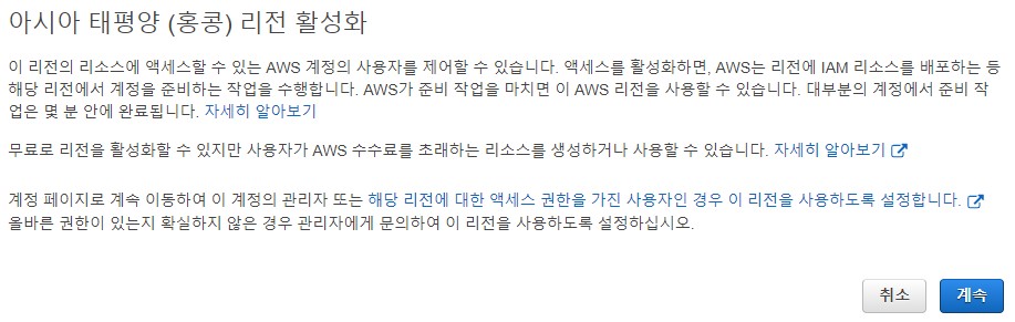홍콩 / 바레인 리전이 리전 리스트엔 있으나 들어가면 활성화 하라고 뜬다. 이전에는 리전 선택버튼이 비활성화로 되어있었다.