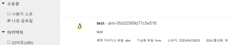 공유된 계정에서 인스턴스 생성 페이지에서 나의 AMI에서 소유권에 나와 공유됨만 체크해본다.