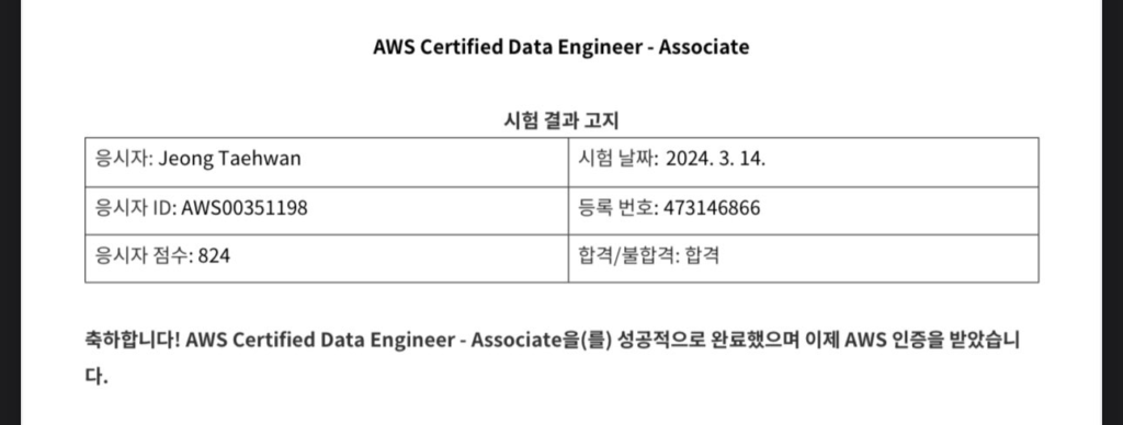 AWS Certified Data Engineer - Associate 자격증은 2024년 3월 12일 정식으로 출시되었으며, 취득일은 3월 14일이다.