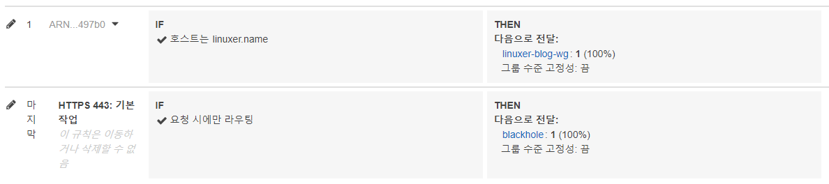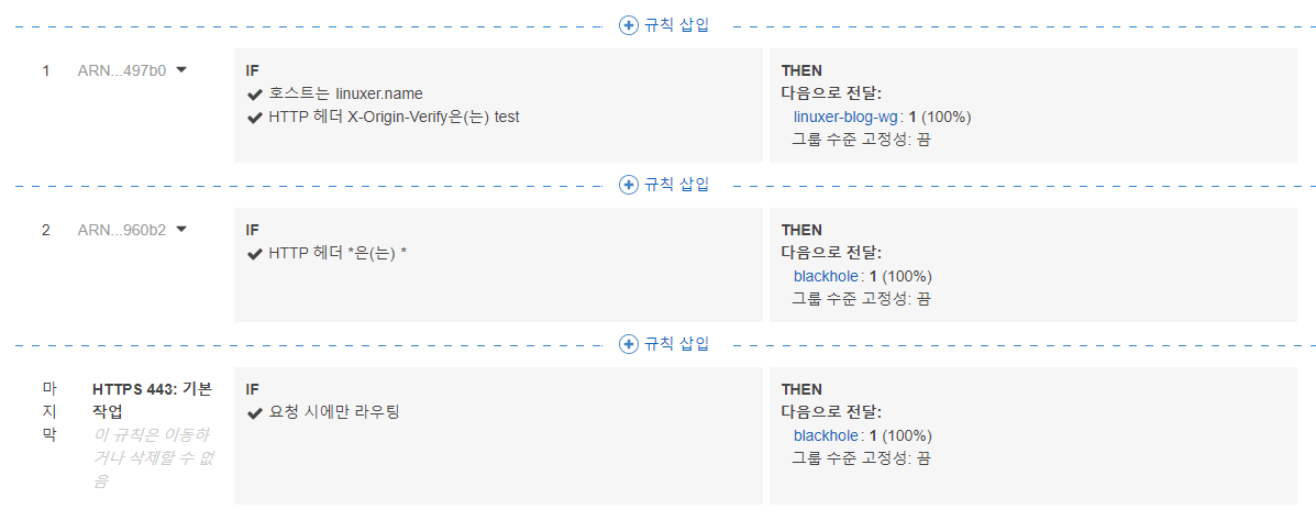 이 규칙이 바로 그것이다. Host 조건에 따라 Host가 다르면 아무 대상이 없는 blackhole 로 전달하게 된다. 그렇다. Custom Header를 ALB에서 필터링 할거다.