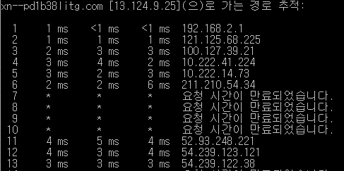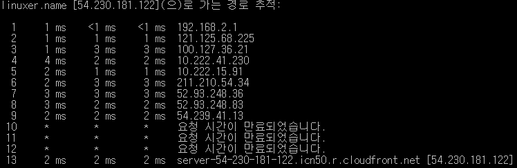 tracert 리눅서.com 1 1 ms <1 ms <1 ms 192.168.2.1 2 1 ms 1 ms 1 ms 121.125.68.225 3 2 ms 3 ms 3 ms 100.127.39.21 4 3 ms 4 ms 2 ms 10.222.41.224 5 3 ms 2 ms 3 ms 10.222.14.73 6 2 ms 2 ms 6 ms 211.210.54.34 7 * * * 요청 시간이 만료되었습니다. 8 * * * 요청 시간이 만료되었습니다. 9 * * * 요청 시간이 만료되었습니다. 10 * * * 요청 시간이 만료되었습니다. 11 4 ms 5 ms 4 ms 52.93.248.221 12 4 ms 3 ms 4 ms 54.239.123.121 13 3 ms 3 ms 3 ms 54.239.122.38