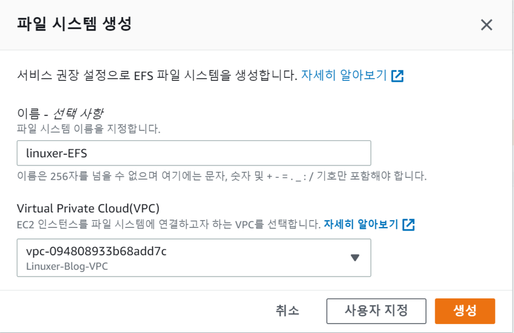원래는 보안그룹이나 태그 처리량 모드같은걸 설정해서 만들수 있었는데.. 했더니 사용자 지정 모드가 생겼다.