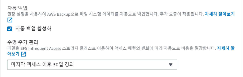 자동백업과 수명주기 관리가 30일로 변경된것이다.