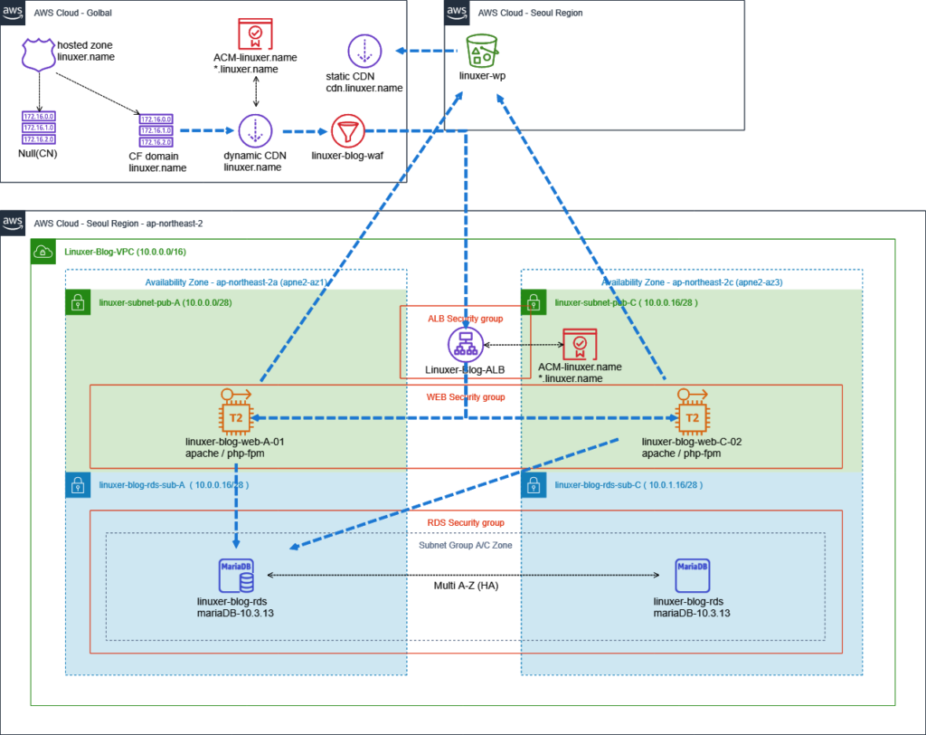 cf 는 버지니아 북부의 acm을 이용하여 도메인을 인증하고 인증된 도메인은 waf 연결된다. waf는 서울리전의 alb에 연결되어있다.