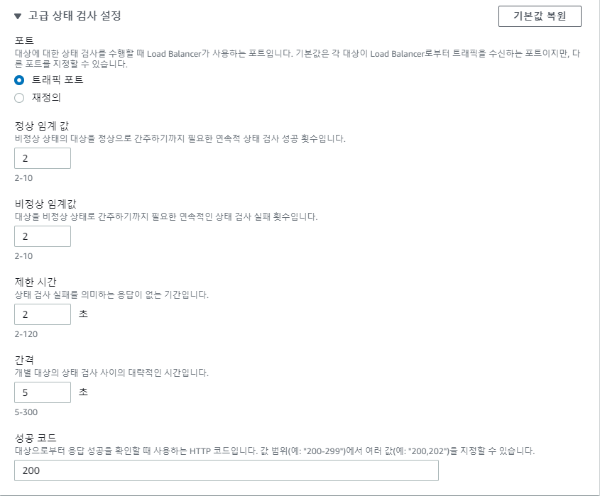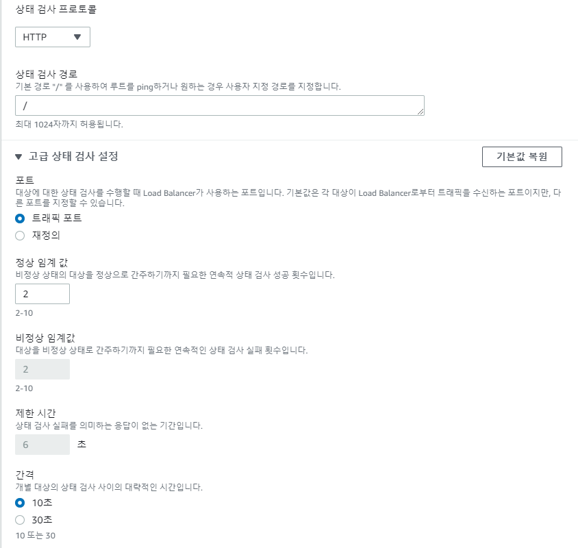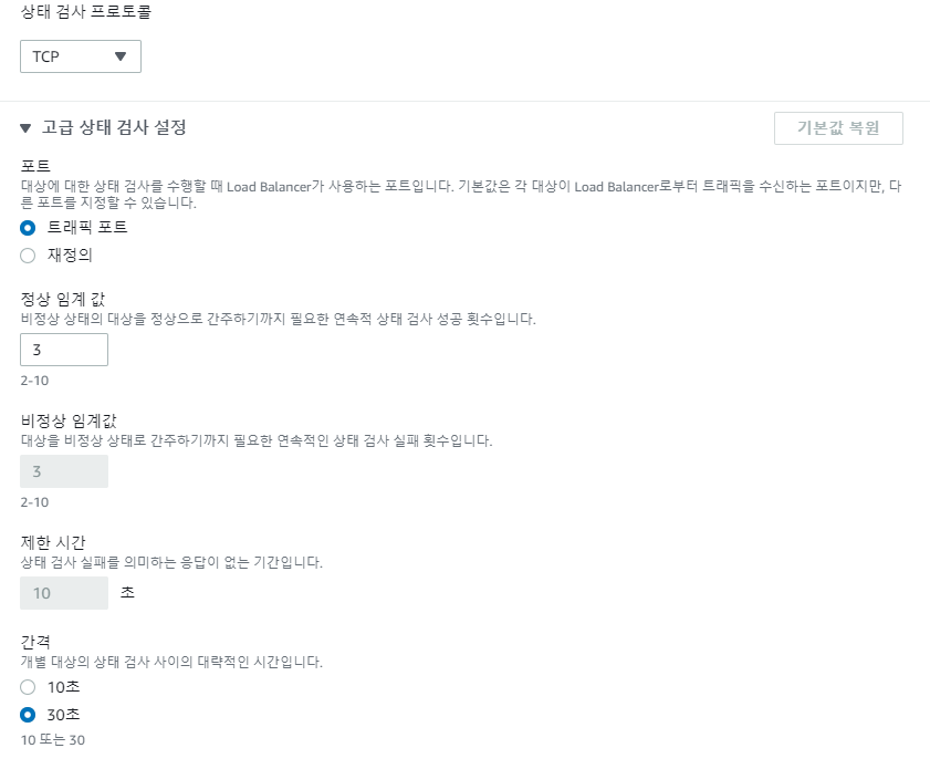 상태 검사 프로토콜이 TCP 일 경우 인터벌 30초 임계값2가 최소 스펙이다. ALB에 비해 엄청나게 느린것이다. 이것을 짧게 수정하고 싶다면 상태검사 프로토콜을 HTTP로 해야한다. 대상그룹의 대상 프로토콜은 TCP로 하되 상태검사는 HTTP로 하는것이다. 대상과 상태검사의 프로토콜을 별도로 사용할수 있는것이다.