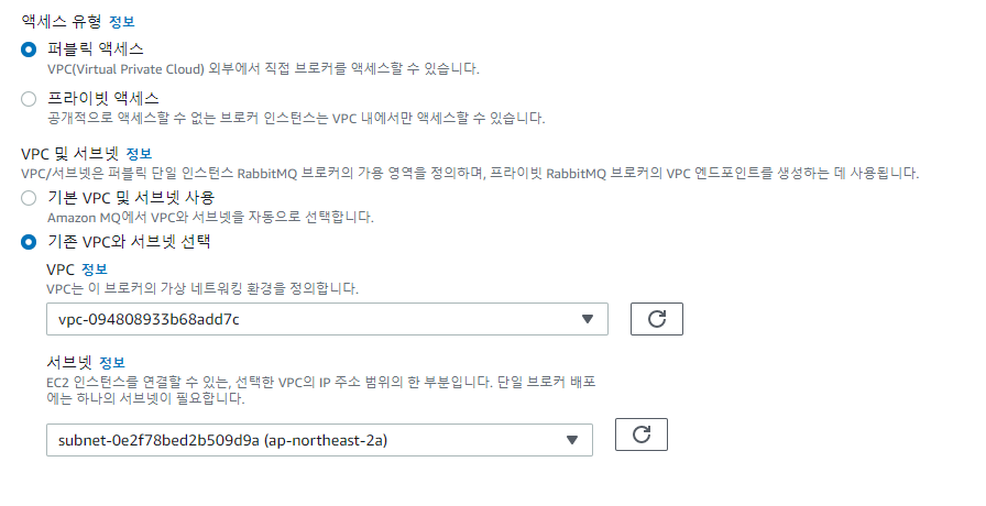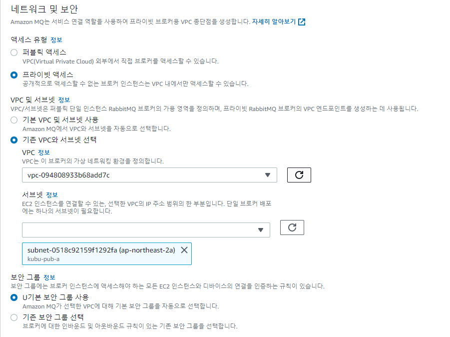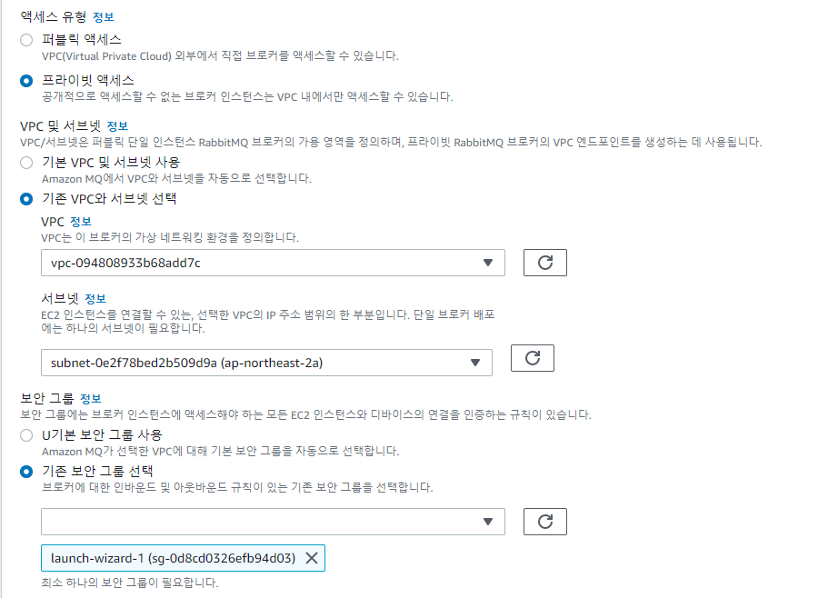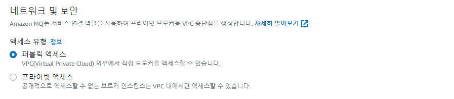 프라이빗 엑세스를 선택해야 보안그룹를 선택할수 있다. 이게 가장 큰 차이점. 그리고 한번 퍼블릭으로 생성한 MQ는 영원히 퍼블릭이다. 프라이빗은 영원히 프라이빗..