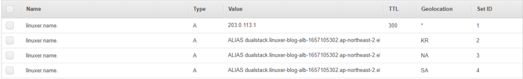 그리고 set ID 2 / 3 /4 는 한국/남아메리카/북아메리카 로 설정하고 로드벨런서와 연결한다.