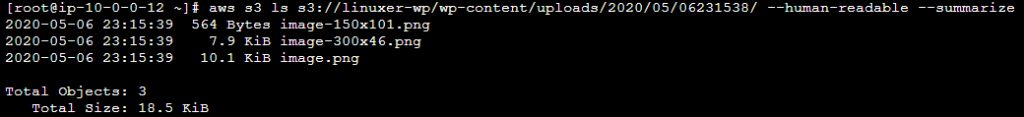 aws s3 ls s3://linuxer-wp/wp-content/uploads/2019/08/ –human-readable –summarize