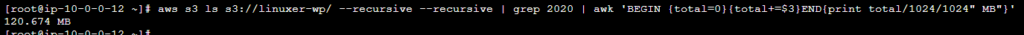 aws s3 ls s3://linuxer-wp/ –recursive –recursive | grep 2020 | awk ‘BEGIN {total=0}{total+=$3}END{print total/1024/1024" MB"}’