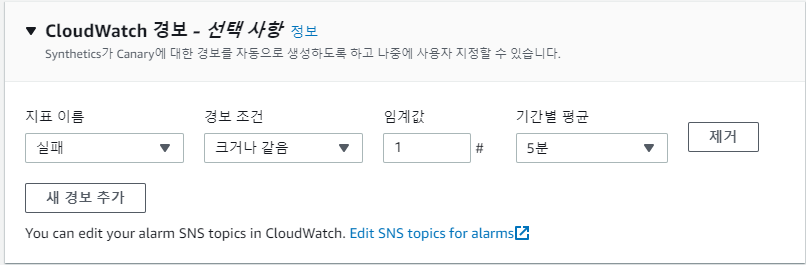 1분마다 하고 5분 평균 임계값을 1로 설정하여 상당히 예민한 모니터링 설정을 하였다. 사이트 URL 체크가 1번만 실패해도 SNS로 경보가 동작한다.