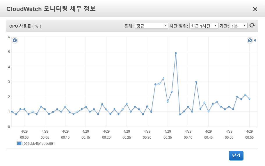 t2.micro 의 경우에는 인스턴스의 CPU가 좀 오르는게 보였으나.. 뭐 이정도는 감당할 만하다. 모니터링으로 인해 부하가 발생하는것이 불편하다면 특정 모니터링 URL만 만들어서 부하를 줄여서 모니터링 하는것이 방법일것이다.