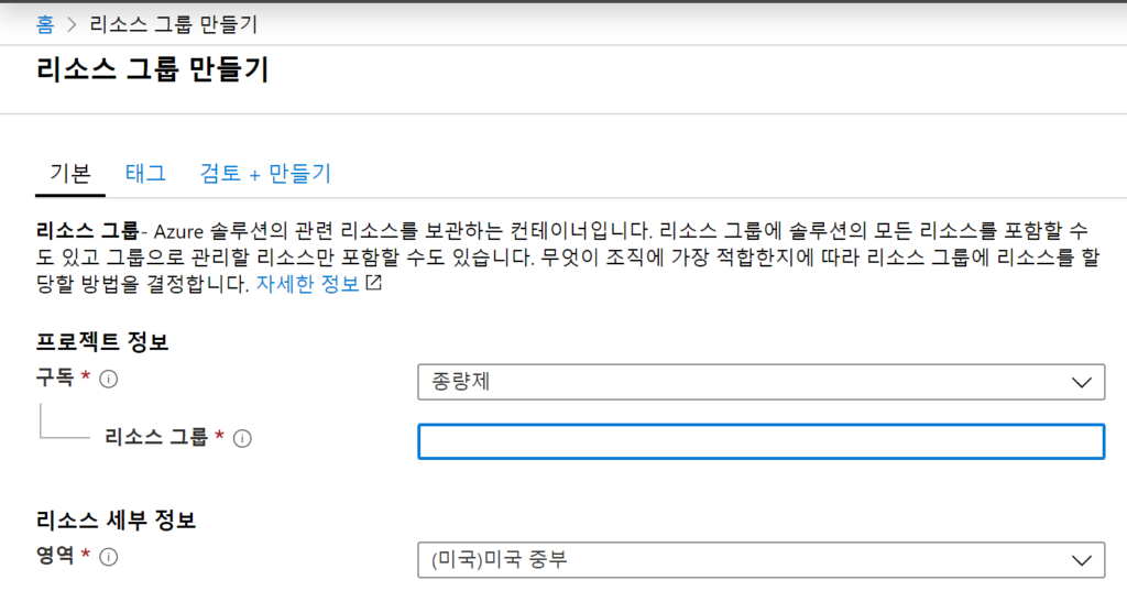 한국리전은 중부와 남부로 나뉘는데 중부를 azure 에선 중부를 주로 추천하는데 나는 중부말고 남부를 선택했다.