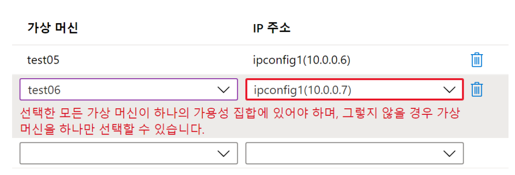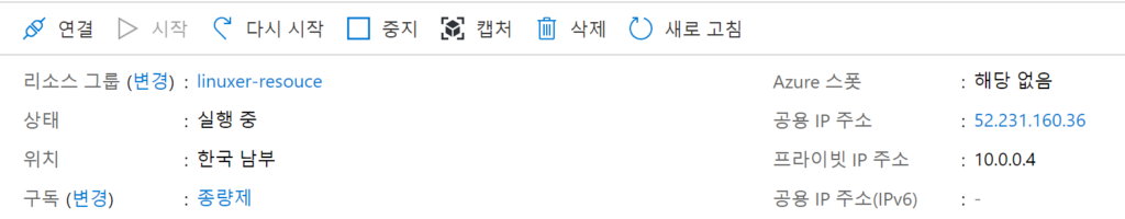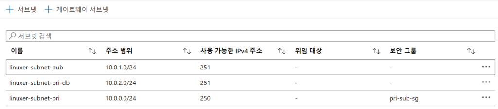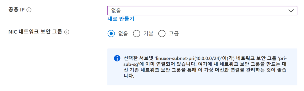 선택한 서브넷 ’linuxer-subnet-pri(10.0.0.0/24)‘이(가) 네트워크 보안 그룹 ‘pri-sub-sg’에 이미 연결되어 있습니다. 여기에 새 네트워크 보안 그룹을 만드는 대신 기존 네트워크 보안 그룹을 통해 이 가상 머신과 연결을 관리하는 것이 좋습니다.