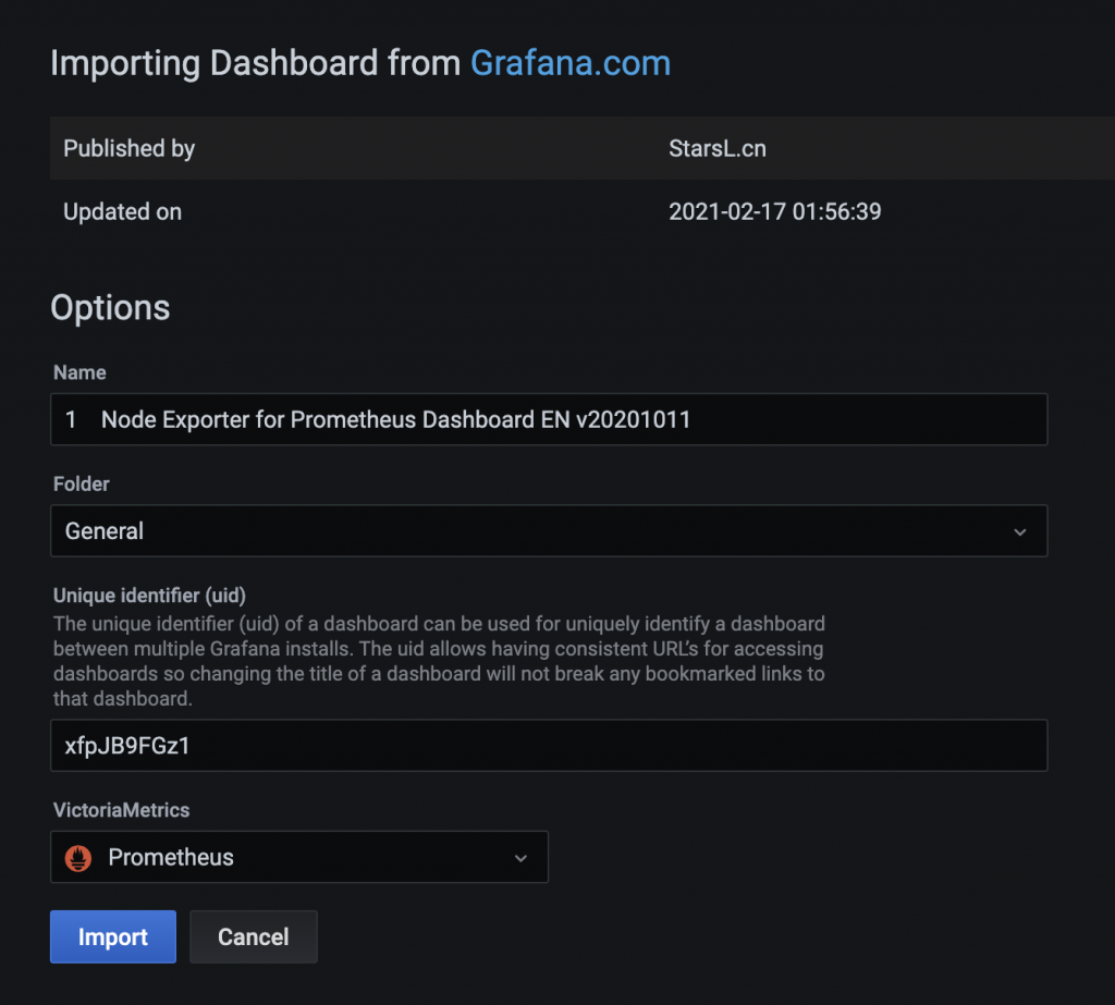 VictoriaMetrics 를 프로메테우스로 지정하자. 그리고 Import 하면 대시보드가 뜬다.