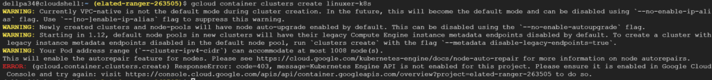 linuxer@cloudshell:~ (elated-ranger-263505)$ gcloud container clusters create linuxer-k8s