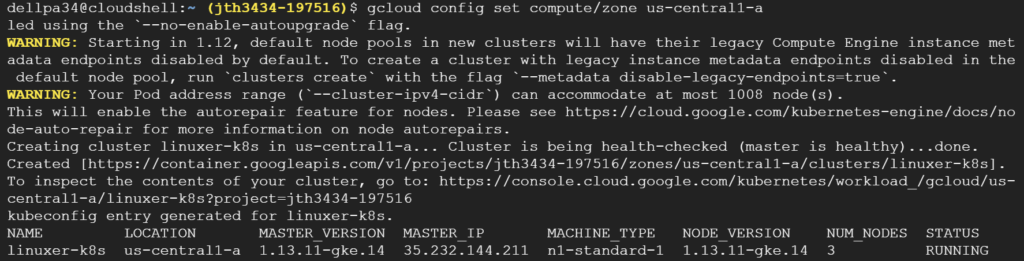 gcloud container clusters get-credentials linuxer-k8s@cloudshell:~ (jth3434-197516)$ gcloud config set compute/zone us-central1-a
