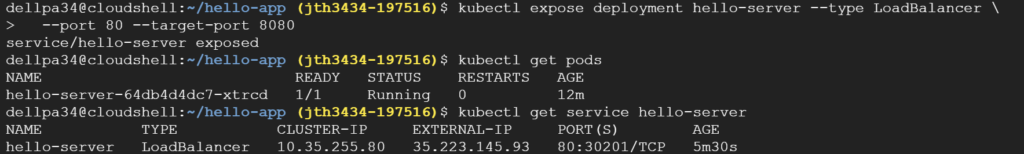 @cloudshell:~/hello-app (jth3434-197516)$ kubectl create deployment hello-server –image=gcr.io/google-samples/hello-app:1.0