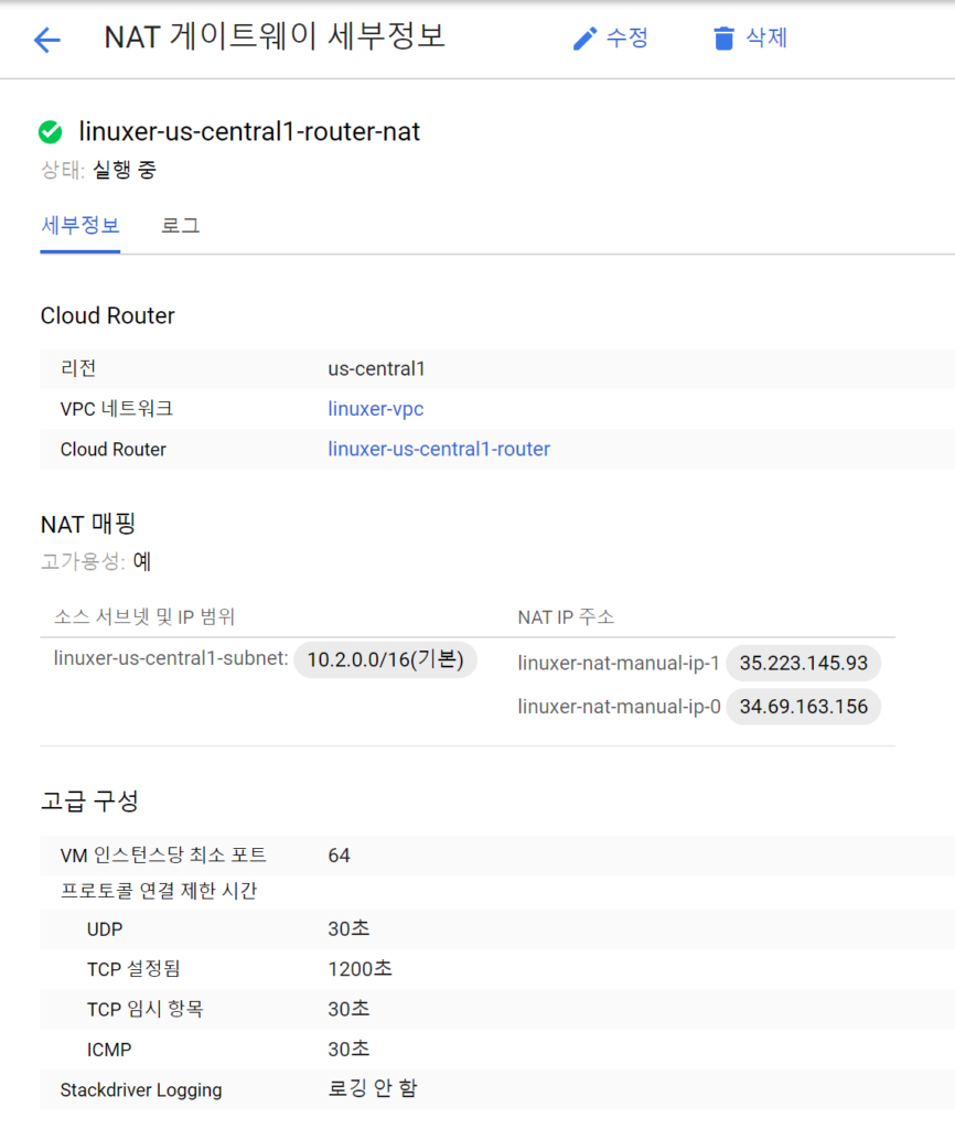 resource “google_compute_subnetwork” “us-central1-subnet” { name = “${local.name_suffix}-us-central1-subnet” ip_cidr_range = “10.2.0.0/16” region = “us-central1” network = “${google_compute_network.vpc.self_link}” } resource “google_compute_router” “us-central1-router” { name = “${local.name_suffix}-us-central1-router” region = google_compute_subnetwork.us-central1-subnet.region network = google_compute_network.vpc.self_link } resource “google_compute_address” “address” { count = 2 name = “${local.name_suffix}-nat-manual-ip-${count.index}” region = google_compute_subnetwork.us-central1-subnet.region } resource “google_compute_router_nat” “nat_manual” { name = “${local.name_suffix}-us-central1-router-nat” router = google_compute_router.us-central1-router.name region = google_compute_router.us-central1-router.region nat_ip_allocate_option = “MANUAL_ONLY” nat_ips = google_compute_address.address.*.self_link