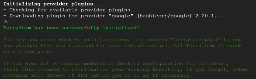 Initializing provider plugins… Checking for available provider plugins… Downloading plugin for provider “google” (hashicorp/google) 2.20.1… Terraform has been successfully initialized! You may now begin working with Terraform. Try running “terraform plan” to see any changes that are required for your infrastructure. All Terraform commands should now work. If you ever set or change modules or backend configuration for Terraform, rerun this command to reinitialize your working directory. If you forget, other commands will detect it and remind you to do so if necessary.