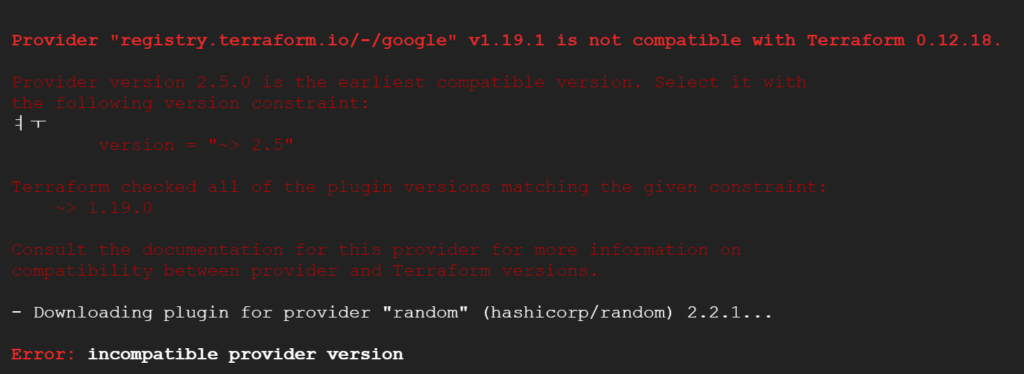 Provider “registry.terraform.io/-/google” v1.19.1 is not compatible with Terraform 0.12.18. Provider version 2.5.0 is the earliest compatible version. Select it with the following version constraint: