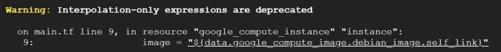 Warning: Interpolation-only expressions are deprecated on main.tf line 9, in resource “google_compute_instance” “instance”: 9: image = “${data.google_compute_image.debian_image.self_link}”