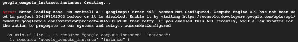 Error: Error loading zone ‘us-central1-a’: googleapi: Error 403: Access Not Configured. Compute Engine API has not been used in project 45002 before or it is disabled. Enable it by visiting https://console.developers.google.com/apis/api/compute.googleapis.com/overview?project=304102002 then retry. If you enabled this API recently, wait a few minutes for the action to propagate to our systems and retry., accessNotConfigured on main.tf line 1, in resource “google_compute_instance” “instance”: 1: resource “google_compute_instance” “instance” {