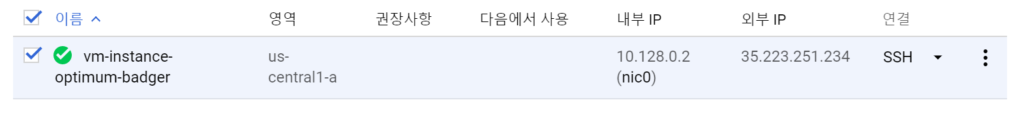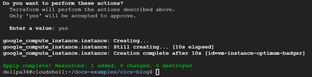 Enter a value: yes google_compute_instance.instance: Creating… google_compute_instance.instance: Still creating… [10s elapsed] google_compute_instance.instance: Creation complete after 10s [id=vm-instance-optimum-badger] Apply complete! Resources: 1 added, 0 changed, 0 destroyed.