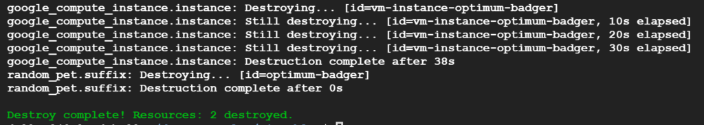 google_compute_instance.instance: Destroying… [id=vm-instance-optimum-badger] google_compute_instance.instance: Still destroying… [id=vm-instance-optimum-badger, 10s elapsed] google_compute_instance.instance: Still destroying… [id=vm-instance-optimum-badger, 20s elapsed] google_compute_instance.instance: Still destroying… [id=vm-instance-optimum-badger, 30s elapsed] google_compute_instance.instance: Destruction complete after 38s random_pet.suffix: Destroying… [id=optimum-badger] random_pet.suffix: Destruction complete after 0s