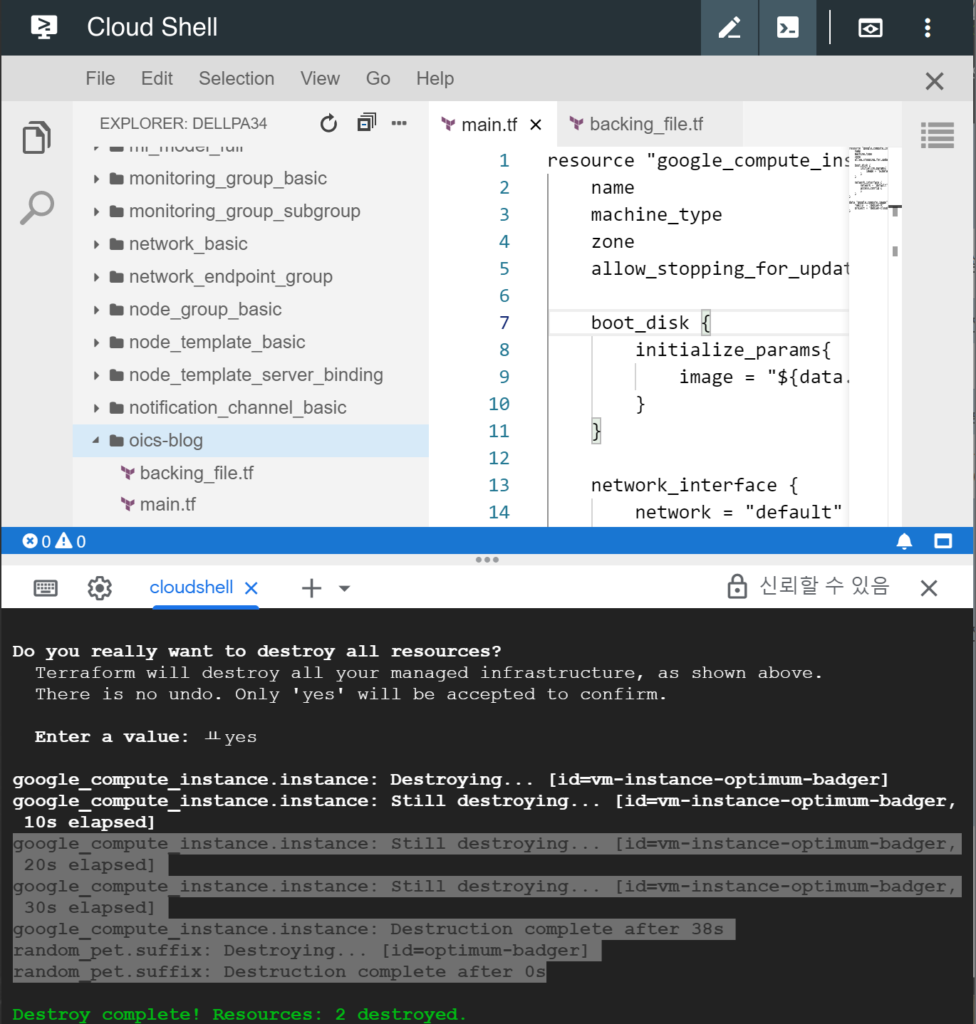 gcp cloud shell 에서 terraform 을 사용하는 방법을 테스트해 보았다. 다음엔 VPC 구성과 인스턴스 그룹 생성 로드벨런서 구성까지 한방에 진행할것이다.
