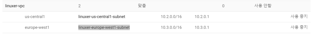 VPC : linuxer-vpc linuxer-us-central1-subnet us-central1 / 10.2.0.0/16 linuxer-europe-west1-subnet europe-west1 / 10.3.0.0/16