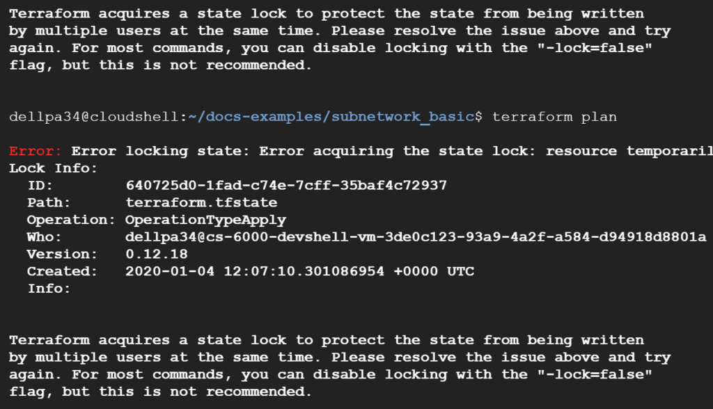 dellpa34@cloudshell:~/docs-examples/subnetwork_basic$ terraform plan Error: Error locking state: Error acquiring the state lock: resource temporarily unavailable Lock Info: ID: 640725d0-1fad-c74e-7cff-35baf4c72937 Path: terraform.tfstate Operation: OperationTypeApply Who: dellpa34@cs-6000-devshell-vm-3de0c123-93a9-4a2f-a584-d94918d8801a Version: 0.12.18 Created: 2020-01-04 12:07:10.301086954 +0000 UTC Info: Terraform acquires a state lock to protect the state from being written by multiple users at the same time. Please resolve the issue above and try again. For most commands, you can disable locking with the “-lock=false” flag, but this is not recommended.