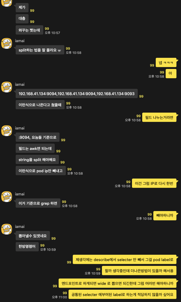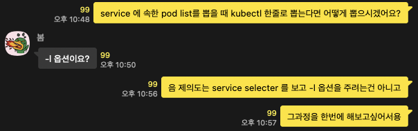 kubectl. 에서 svc 를 get하고 -o wide 명령어를 쓰면 selector 가보인다. 거기서 get pod -l app=my-nginx1 이라 일일이 지정해줘야지만 확인할수 있다. 명령어 두줄치면 되긴한데 귀찮다. 이렇게 된이상 한줄치기는 물러설수 없다.