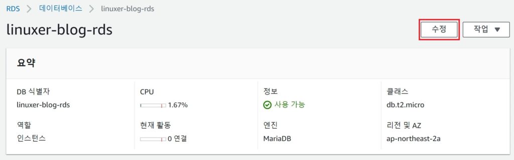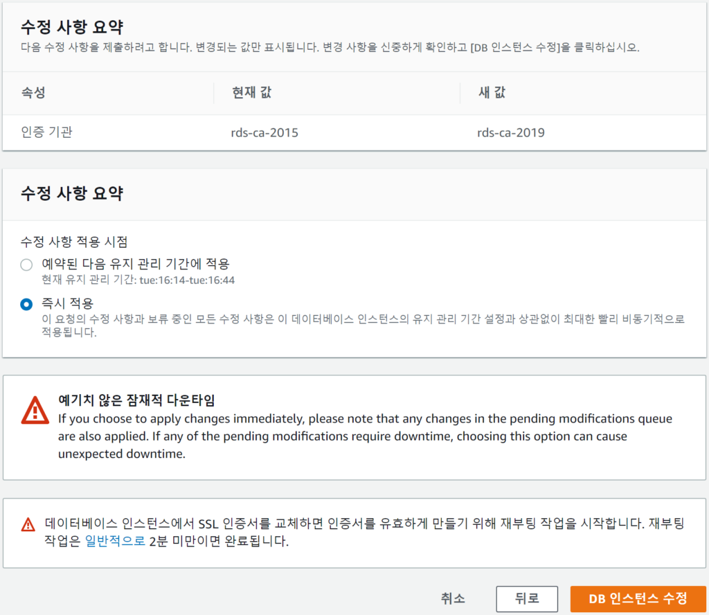 그럼 이제 테스트할것은 RDS CA-2015 을 CA-2019 로변경하고 rds-ca-2015-ap-northeast-2.pem 인증서로 접근해 볼것이다. 인증기관을 변경하는 방법은 다음과 같다.