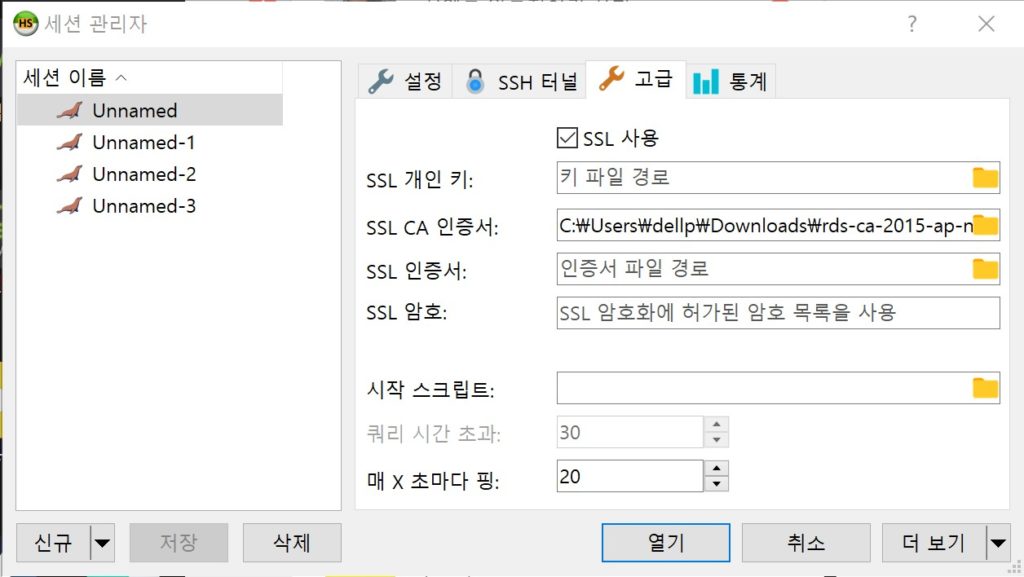 접속 정보는 이미 모두 적용된 세션에 SSL CA 만 추가해서 접속한다