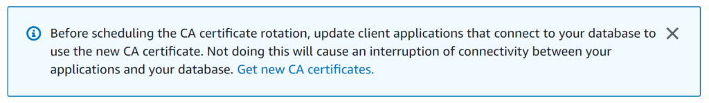 To protect your communications with RDS database instances, a Certificate Authority (CA) generates time-bound certificates that are checked by your database client software to authenticate any RDS database instance(s) before exchanging information. Following industry best practices, AWS renews the CA and creates new certificates on a routine basis to ensure RDS customer connections are properly protected for years to come. The current CA expires on March 5, 2020, requiring updates to existing RDS database instances with certificates referencing the current CA.