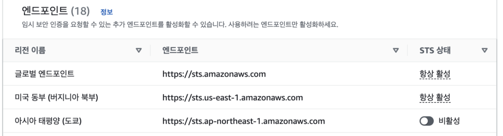 위에서 로그인 URL에 도쿄리전으로 파라미터가 들어가있는데 그 대로 로그인 해보겠다. 그전에 나의 계정에선 도쿄의 STS 엔드포인트를 비활성화하였다.