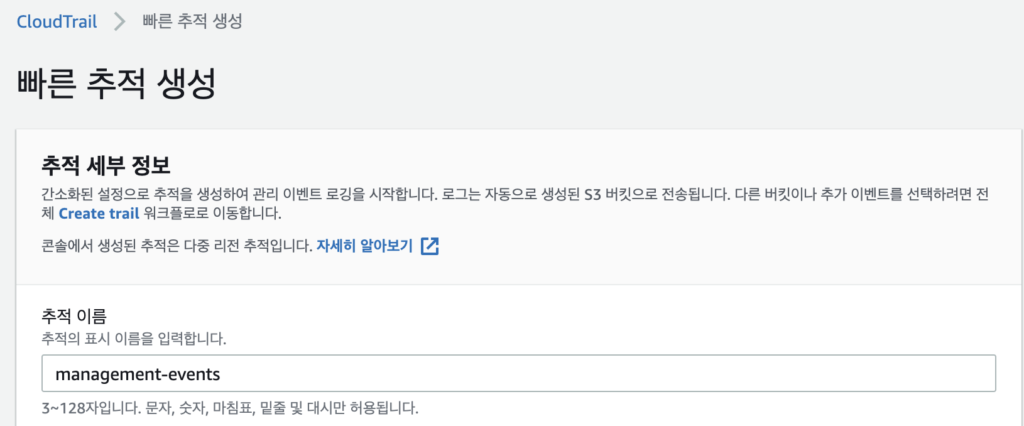 <https://docs.aws.amazon.com/ko_kr/awscloudtrail/latest/userguide/cloudtrail-create-and-update-a-trail-by-using-the-aws-cli-update-trail.html#cloudtrail-create-and-update-a-trail-by-using-the-aws-cli-examples-gses>
