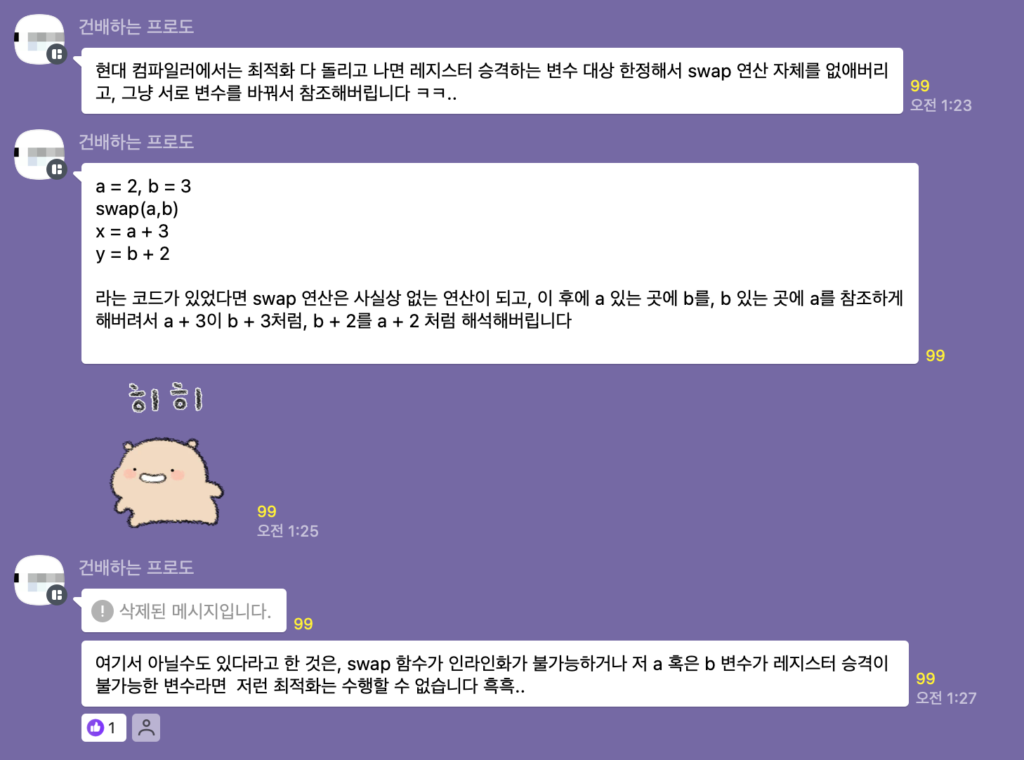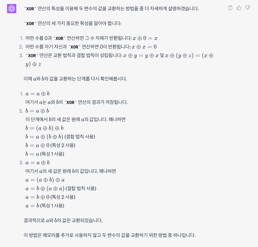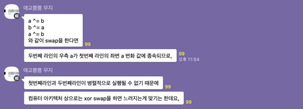 그러던중 현대의 컴파일러에선 XOR가 메모리를 사용하지 않지만 병렬처리에서의 문제로 성능이 떨어진다는 이야기를 들었다.